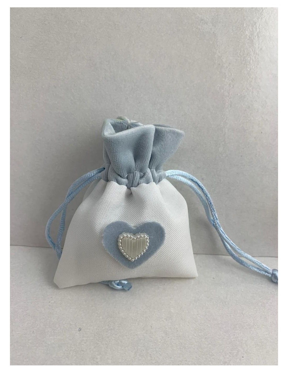 12 PEZZI DI SACCHETTI VELLUTINO BIANCO E CELESTE CON DECORAZIONE CUORE