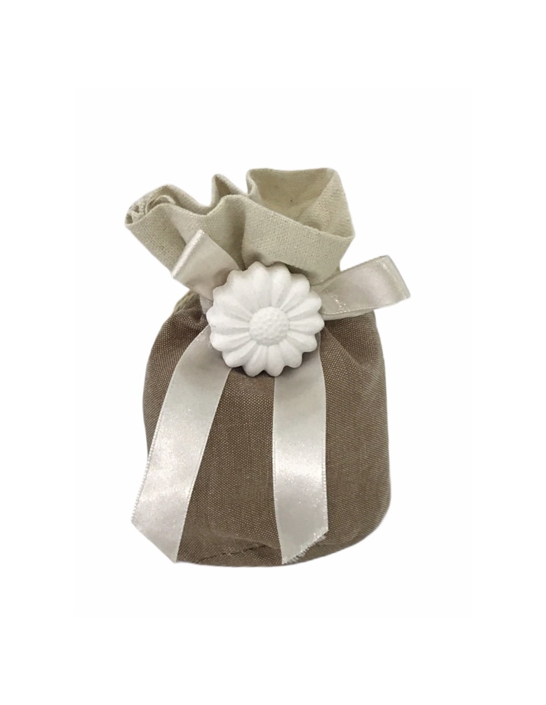 12 PEZZI DI SACCHETTINI IN COTONE MARRONE E PANNA,CON FIOCCO RASO E GESSO FIORE